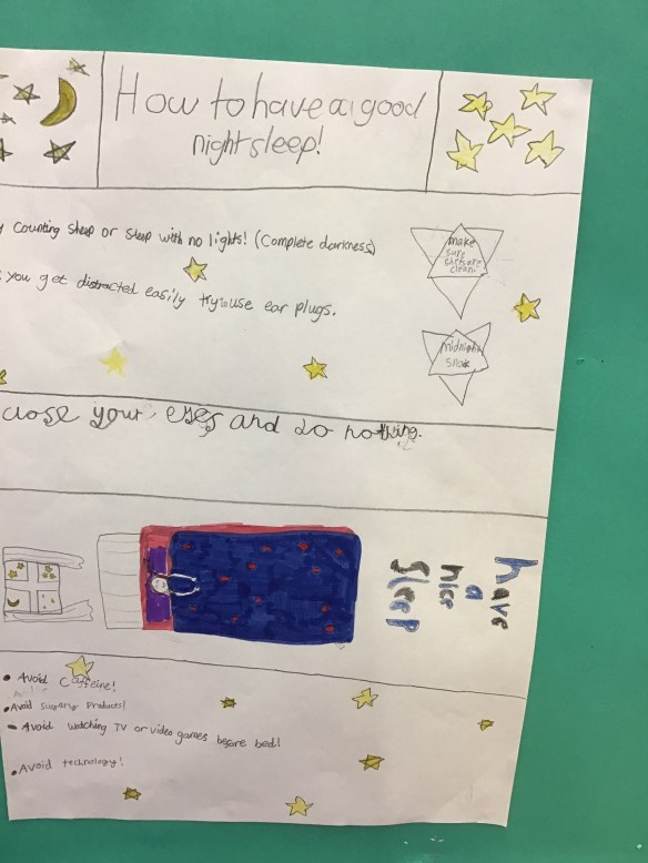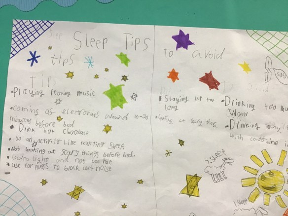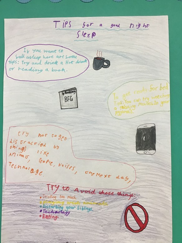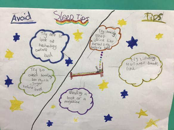 We looked at the sleep cycle, what happens to our body & mind during sleep and discussed why it is important to get a good night’s sleep. We rated our own sleep each night & shared ways to help us get a good night’s sleep. We worked very well in small groups to create a poster to share our ideas with the whole school!